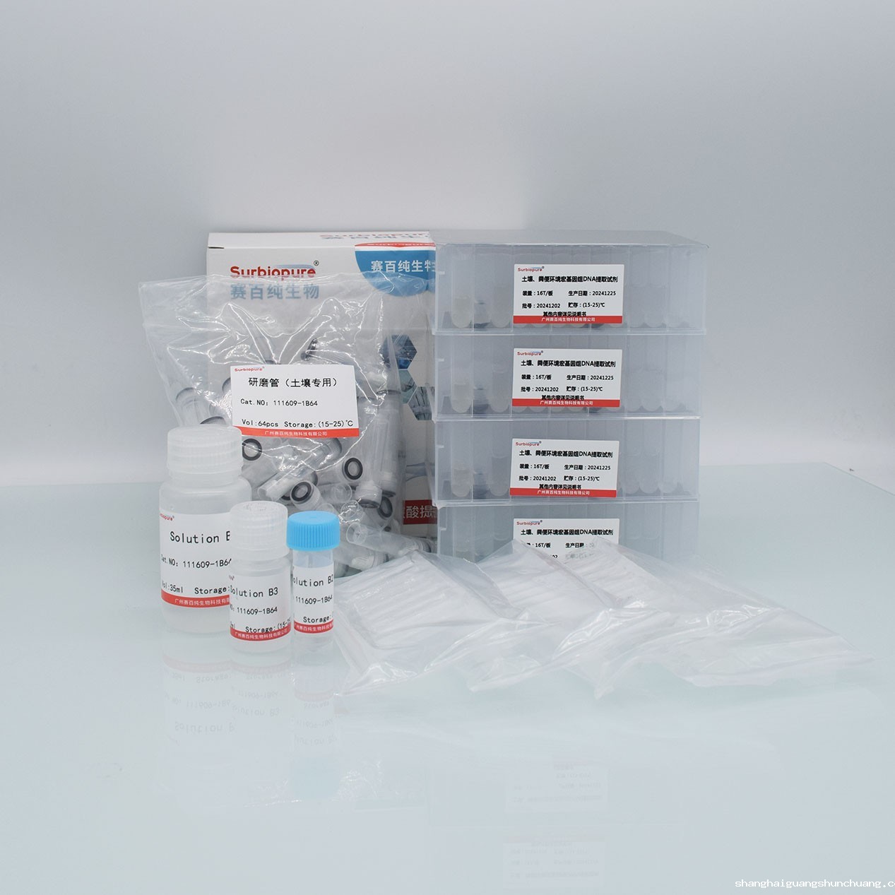 【预期用途】本试剂盒可从 250 - 500mg 多种土壤、粪便样本中提取高纯度 DNA,裂解液与研磨管协同作用充分裂解样本释放 DNA,独特沉淀液可以有效去除腐殖质、蛋白质、色素等杂质,磁珠在结合液与洗脱液作用下实现 DNA 快速分离纯化。整个实验过程无需酚/氯仿等有机试剂进行抽提,操作简便,提取的 DNA 浓度、纯度高,完整性好,无蛋白质、盐类及其他杂质污染,可用于酶切、PCR、文库构建、Southern 杂交、荧光定量 PCR、芯片分析、一代及二代测序等多种下游科研检测实验。